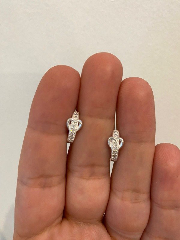 Argollitas de Plata 925 de 10mm. con pequeños strass un corazoncito en medio. Precio por Par. Cód.1000004.sku 32