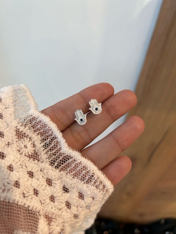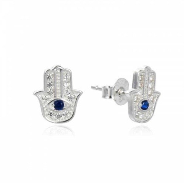 Aros pasantes con diseño de mano Fatima, para la protección. Tienen cubic blanco y strass azul en el centro. Largo total 10mm. ¡Ideales para primer o segundo agujerito! Precio por unidad. Cód.1000001 SKU:113
