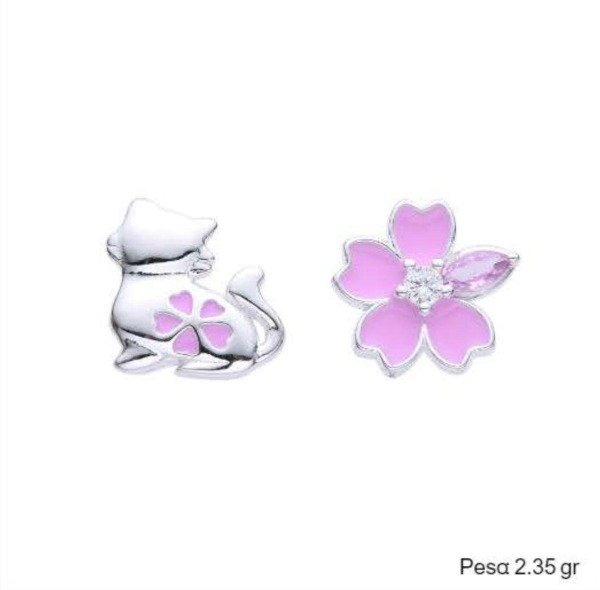 Conjunto de aros pasantes con diseño de gatito con flor rosa y flor de color rosa con centro de strass engarzado y con strass rosa en un pétalo. ¡Combínalos como mas te gusten! Precio por par. Cód. 1000003