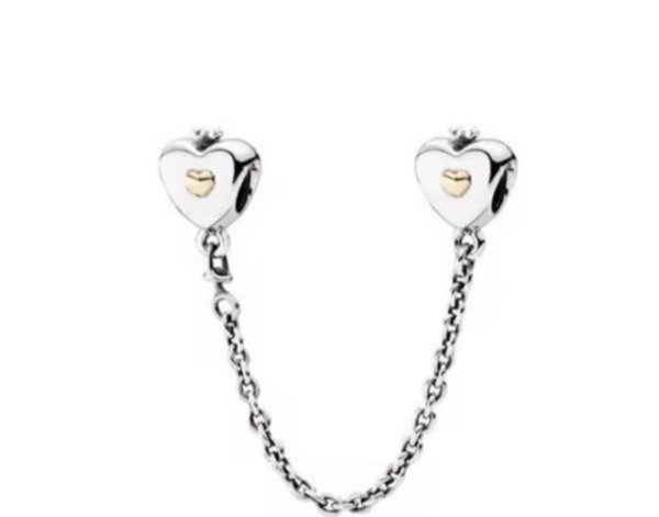 Charms de seguridad de Plata 925 con diseño de dos corazones, en el medio tienen un corazoncito mas chiquito dorado, unidos por una cadenita. CÓD.1316 SKU:C-6