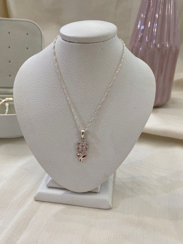 Dije de plata-925 diseño de flor con centro y pétalos de strass engarzado y tallo de plata con strass en la hoja.